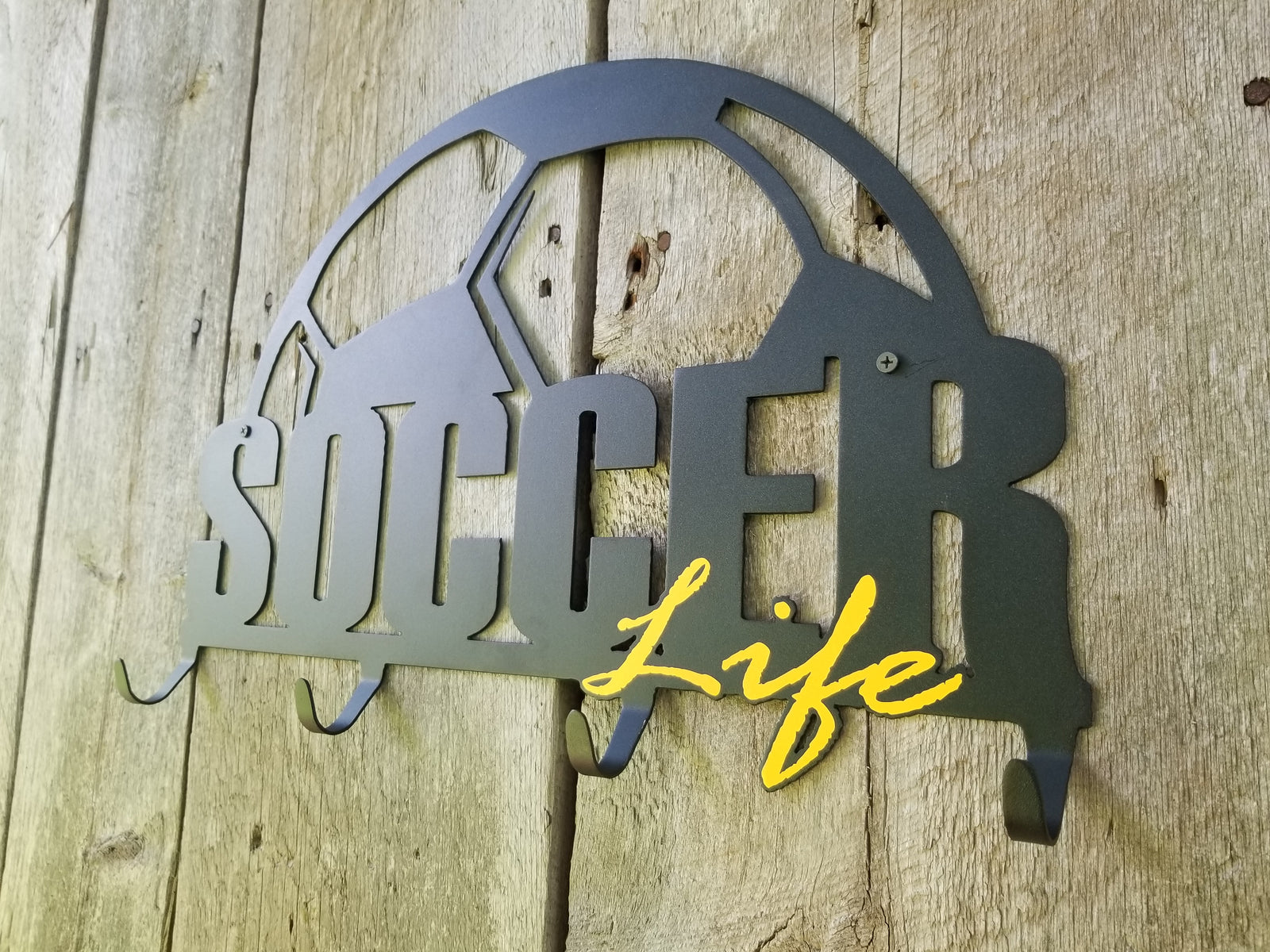 SHOW OFF YOUR PASSION by hanging your soccer gear up on the wall and displaying it on one of the coolest hangers on the market.  Our hangers are proudly made in the USA cut from steel and powder coated for a most durable finish.  Great for use indoor or outdoor.  Approx. 20.5" wide by 14.5" tall with four hanging hooks. Select the color of "Life" you'd like when ordering